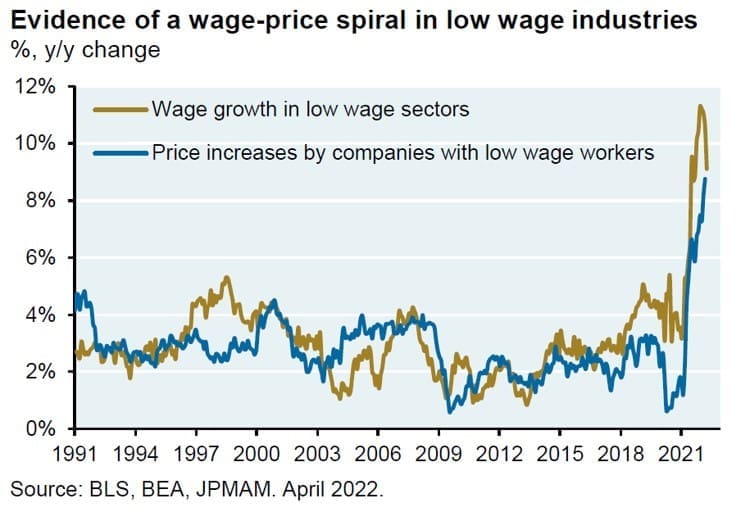 There are numerous reasons for the current bout of inflation, but the most significant ones are: (1) the monetary and fiscal stimulus provided by the Fed and Congress to support the economy during COVID created increased consumer demand, (2) supply chain disruptions and production cutbacks from COVID resulted in diminished supply, (3) job openings have exceeded the number of workers looking for jobs so wages have increased, and (4) Russia’s invasion of Ukraine contributed to a spike higher in commodity prices. As a result, the U.S. economy is now experiencing a “spiral” in wages and prices.