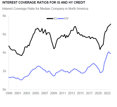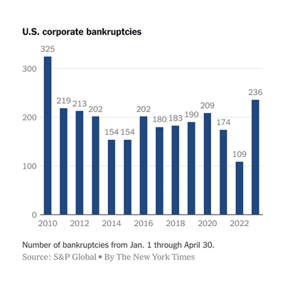 As discussed above, it takes time for higher rates to impact economic activity, and increased borrowing costs could be a headwind for profitability going forward. Currently, however, corporate balance sheets are relatively strong, and most companies have sufficient cash to cover increased borrowing costs. Nonetheless, there are some early warning signs regarding corporate health as well, as corporate bankruptcies have increased significantly so far this year.