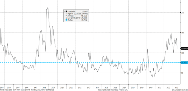 However, the calmness of the equity market is not reflected in the market for US Treasuries, which is driven by interest rate forecasts. Interest rates rose and prices fell in the fixed income markets generally for the second quarter on inflation and rate uncertainty. Volatility in the Treasury markets, measured by the MOVE index remained elevated, reflecting far more concern about the path of inflation and rates than the large-cap equity market has been displaying.