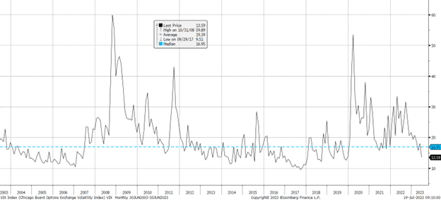 The equity and Treasury markets appear to be predicting different levels of confidence in the Fed’s ability to execute a soft landing. The S&P 500 is reflecting continuing confidence in the soft-landing scenario, returning 8.74% in the second quarter. Seven mega-cap tech stocks drove performance, with returns this year ranging from approximately 40% for Microsoft and Google to almost 200% for Nvidia. The pervasive attention focused on artificial intelligence (A.I.) was a significant reason for these stocks advancing, but so were the prospects of the end of the Fed’s tightening cycle, as lower interest rates would make these companies’ future earnings more attractive. Further, equity market volatility, a measure of market participants’ perception of risk, is at very low levels.