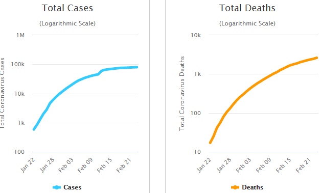 While the number of cases continues to increase steadily, the rate of growth appears to be leveling off (although we cannot be certain of this, as these are in part based on numbers coming out of China that could well be inaccurate).
