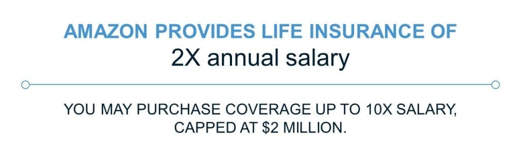 Amazon offers a life insurance benefit of twice an employee’s annual base salary at no cost, up to $500,000. Another $500,000 of accidental death and dismemberment (AD&D) insurance coverage applies for death or injuries resulting from a covered accident. You may purchase additional coverage for up to 10 times your salary, with a maximum benefit of $2 million.