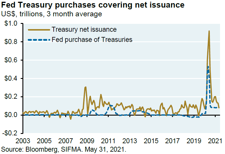 The Fed played a large part in the recovery from the COVID-related recession by spurring lending to support struggling companies and consumers. It did so by moving the Fed Funds rate to zero, buying Treasuries, buying mortgages, and signaling, for the first time in history, that it would buy the debt of private companies. While the Fed is no longer buying the debt of private companies, it continues to buy Treasuries and Mortgage Backed Securities (called Quantitative Easing or QE) at a record pace: currently buying almost all the net issuance of Treasuries and a record amount of Mortgage Backed Securities: