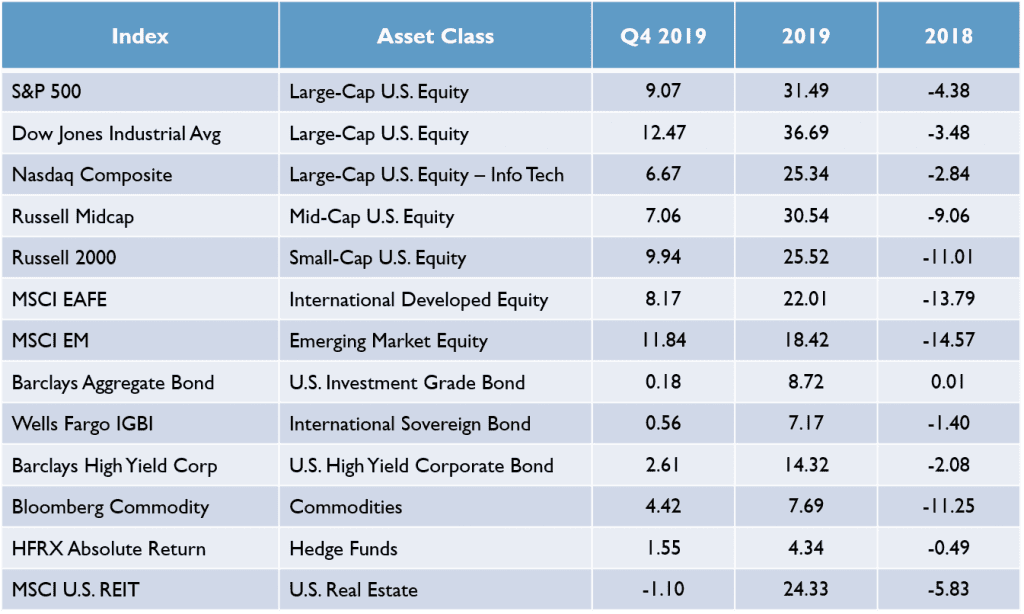 Best wishes for a happy, healthy, and prosperous New Year. As 2020 begins, we wanted to provide you with: (1) a 2019 financial market review, (2) a snapshot of where we are currently, and (3) some thoughts going forward.
