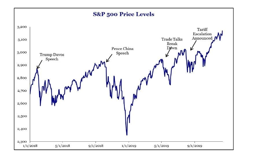 2018’s sharp contraction in valuation multiples reflected investor pessimism about future earnings growth, an outlook that reversed abruptly in 2019. While it is impossible to precisely determine the ingredients that constitute the stew of factors that move markets, it appears that two main ingredients were responsible for financial markets being negative in 2018 and positive in 2019: the Fed and trade policy. In 2018, the Fed steadily raised the Fed Funds rate four times, starting the year at 1.5% and ending the year at 2.5%. These sequential rate hikes progressively spooked financial markets, with the final December 2018 rate hike causing significant volatility in both equities and fixed income. Market participants feared that the Fed was moving too quickly and that higher interest rates could choke off the economic expansion.