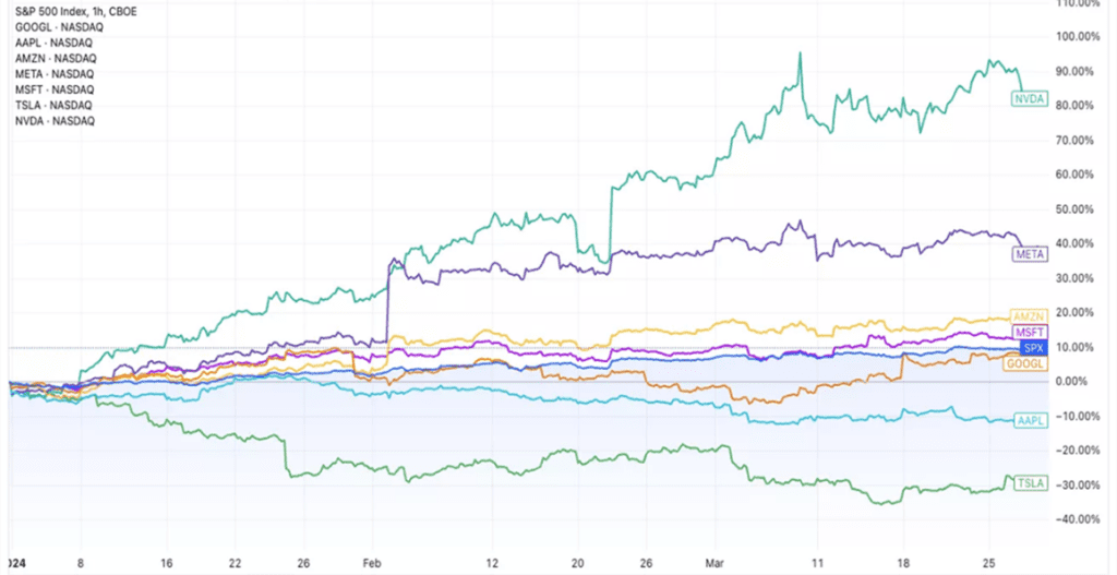 In 2023, gains in the market-cap weighted S&P 500 were primarily driven by seven large cap tech stocks (the Magnificent Seven), but in the first quarter of this year, the equity market broadened out with the number of stocks showing positive performance significantly increasing. At the same time, performance among the Magnificent Seven diverged, with Nvidia outperforming Tesla by a whopping +111.71%