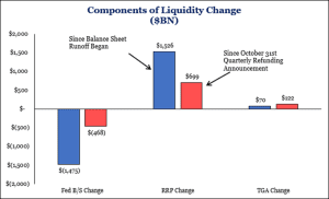The Fed also drained liquidity by borrowing money from banks and money market funds through a mechanism called reverse repo, which takes money out of circulation. While the Feds’ balance sheet reduction is draining liquidity, the usage of reverse repo is also shrinking (financial institutions are borrowing less), counter-acting the effect of the balance sheet shrinkage (see the difference between the blue and red bar in the middle column of the chart below).