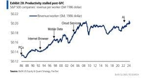 Additionally, the outperformance of the “Magnificent 7” stocks introduces another layer of vulnerability. While their long-term secular growth trends remain intact, their elevated valuations, in conjunction with higher bond yields, highlight the need for investors to consider opportunities among stocks with more attractive valuations. The high valuations on these mega cap companies continue to lean on the premise that they will deliver technologies that improve productivity and drive even further growth across the economy. The exhibit below illustrates the degree to which productivity has been stalled since the Great Financial Crisis.