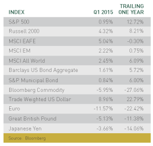After a stunning 13% run in 2014, the S&P 500 took a pause in the first quarter. Other markets have been playing catch-up after lagging the Large Cap index for most of 2014. Not surprisingly, companies that have a smaller percent of their revenue from non-domestic sales will be less impacted by the strong dollar, and we are starting to see that differential play out in the market returns. For instance, small cap stocks, as measured by the Russell 2000 Index, increased at a good clip in the first three months of the year.